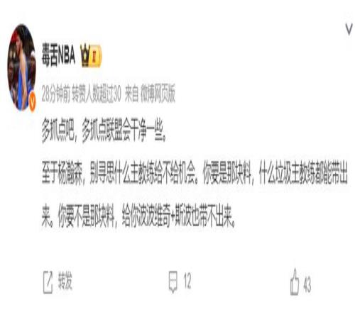 也有一些大V明白,一个新秀不要寻思主教练给不给机会,杨瀚森也不是托关系进的NBA,他需要的还是继续提升自己的即战力,开拓者的球探部门对杨瀚森的观察是长期的,对小杨的培养计划也是长期的,不会因为某个人出了问题就放弃这个计划。
