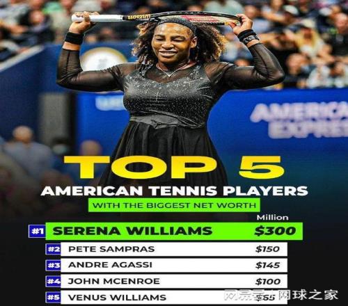 我们再来关注一项数据。有外媒统计了美国最富有的五位网球运动员,他们的身价大多超过1亿美元,美国的大小威姐妹一个位居榜首,一个排在第五位。而排在第二至第四位的是三位男子大神,他们是桑普拉斯、阿加西和麦肯罗。而大小威姐妹的身价总和接近三位大神的总和,可谓阴盛阳衰。五位最富有网球运动员的具体身价如下: