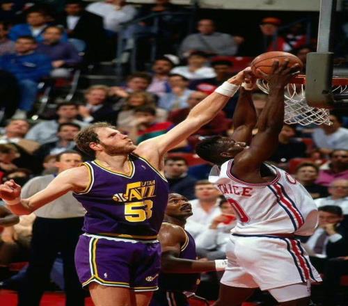 “猛犸象”马克-伊顿是1982年第四轮第三顺位,他身高2.24米,是一名防守型球员。伊顿在NBA打了11个赛季全部效力于爵士,除了最后一个赛季出战64场外,他出战最少的一个赛季也有79场,其中五个赛季打满82场常规赛,对于一个224cm的巨人来说这是非常难得的。伊顿曾两次荣膺最佳防守球员,三次入选一防,他还入选过一次全明星,斩获了四个盖帽王。生涯出战常规赛875场,场均6分7.9篮板,投篮命中率为45.8%,共送出3064次盖帽,排在历史第四位,他也是贾巴尔之后第一个盖帽总数超过3000的球员,他生涯场均盖帽3.5次,位列历史第二。